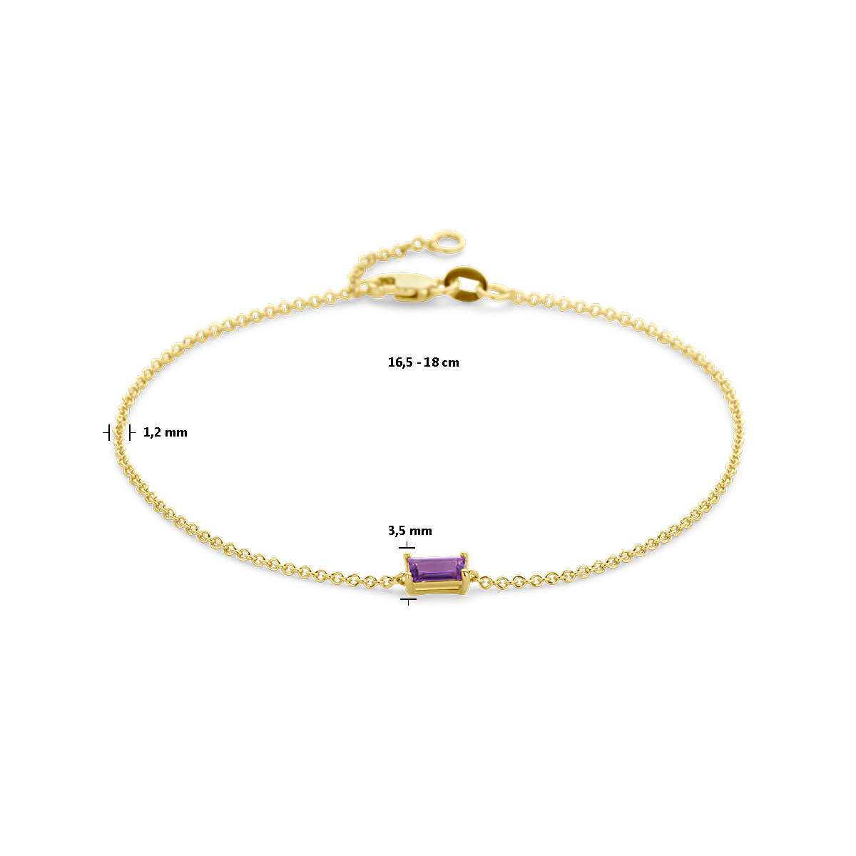 14k Geelgouden armband uitgevoerd met amethist. De armband heeft draaglengtes van 16,5 en 18cm. De schakelbreedte is 1.2mm. Uitgevoerd met een karabijn sluiting.