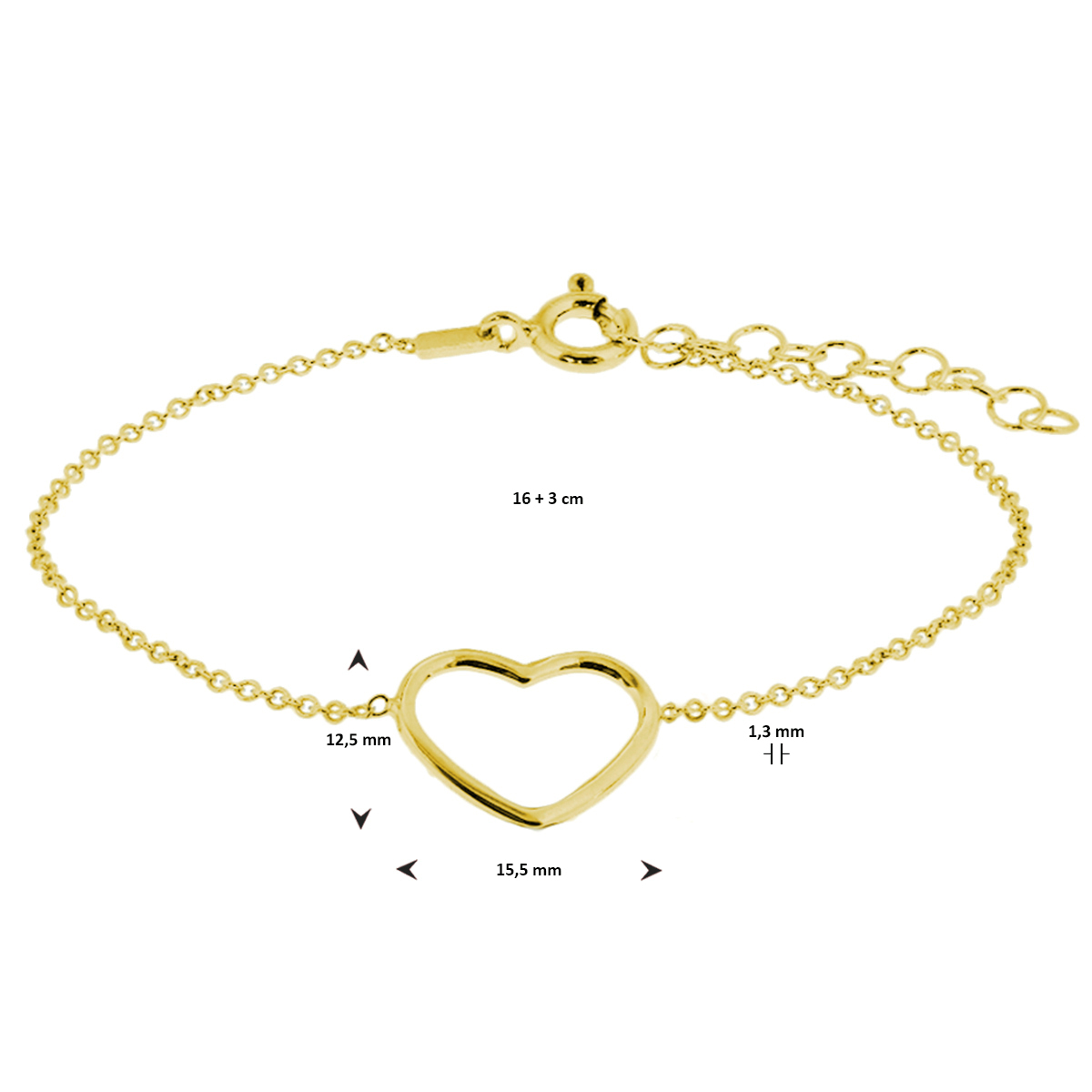 Verguld op 925 zilveren armband uitgevoerd met een hartje. De armband heeft een draaglengte van 16cm met een extensie van 3cm. Het hartje heeft een afmeting van 12.5x15.5mm. De schakelbreedte is 1.3mm. Geen garantie op plating.