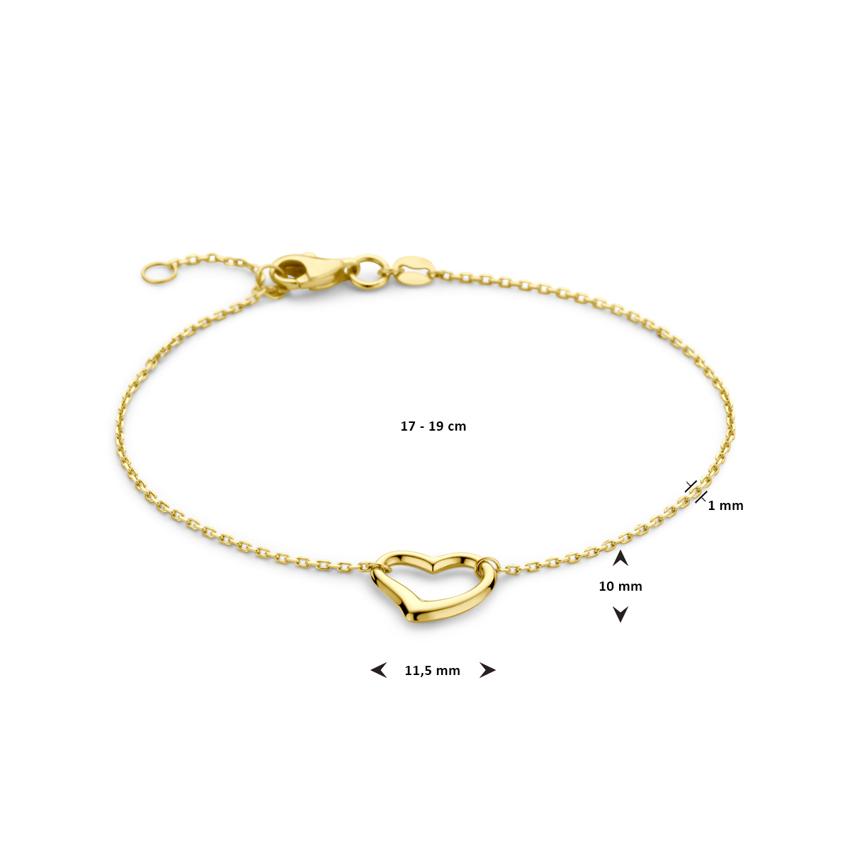 14k Geelgouden armband uitgevoerd met een hart en een karabijn sluiting. De armband heeft een draaglengtes van 17cm en 19cm en een schakelbreedte van 1mm.