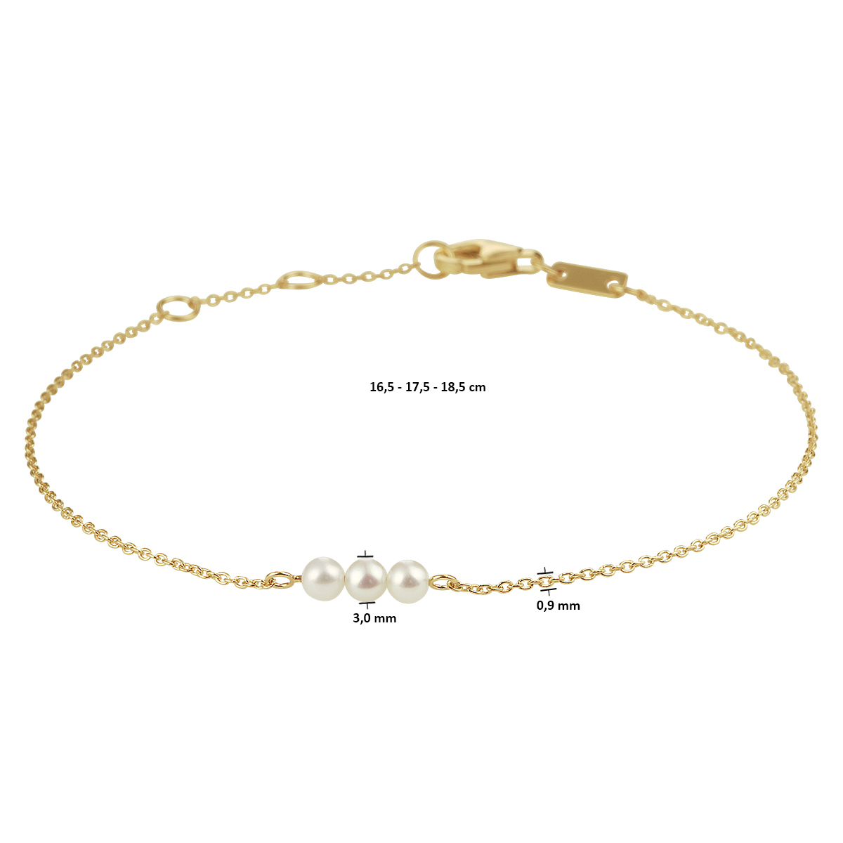 14k Geelgouden armband uitgevoerd met schitterende parels en een stevige karabijn sluiting. De armband heeft draaglengtes van 16.5, 17.5 en 18.5cm en een breedte van 3mm. De schakelbreedte is 0.9mm.