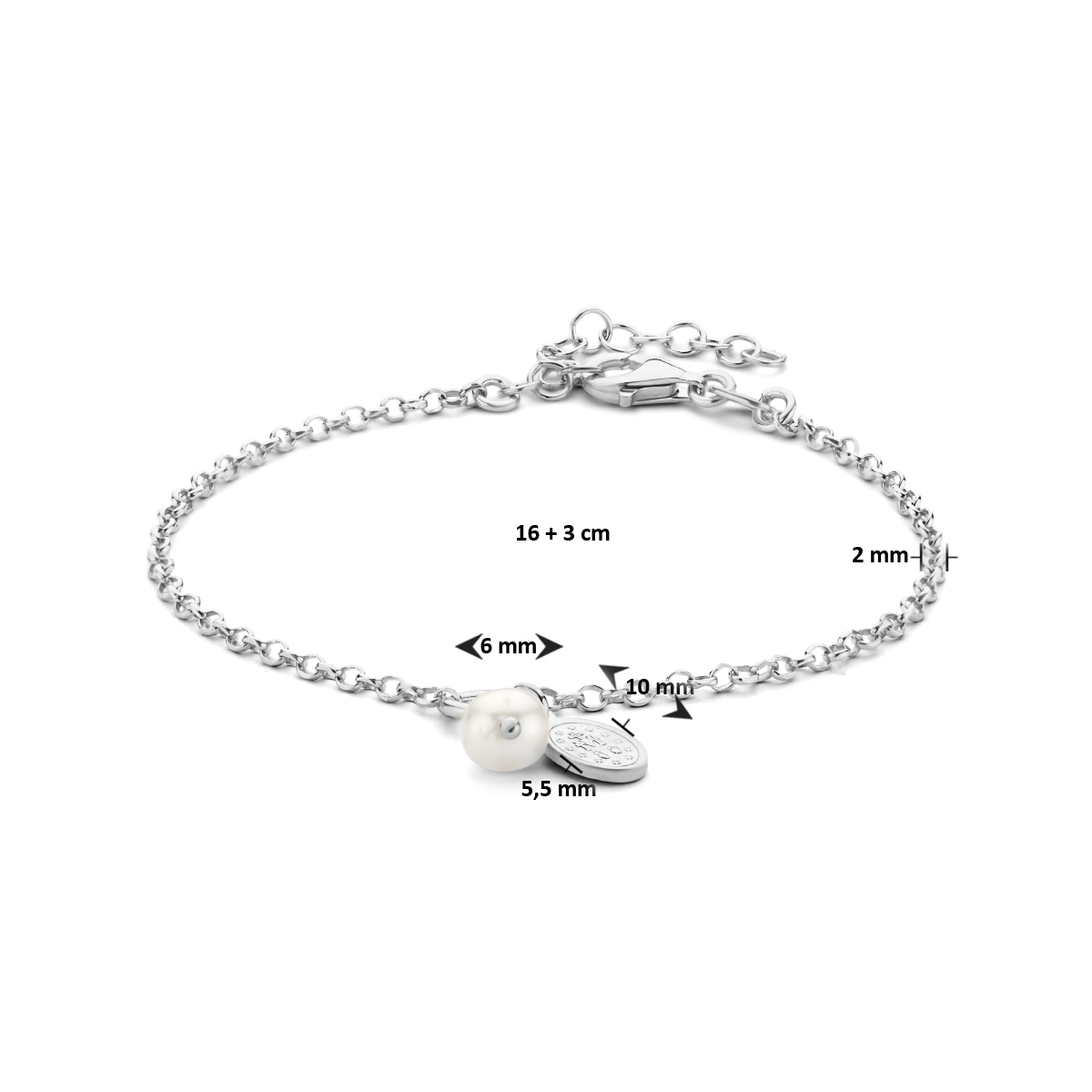 Gerhodineerd 925 zilveren armband uitgevoerd met een zoetwaterparel en een scapulier. De armband heeft een draaglengte van 16cm met een extensie van 3cm en een stevige karabijn sluiting.