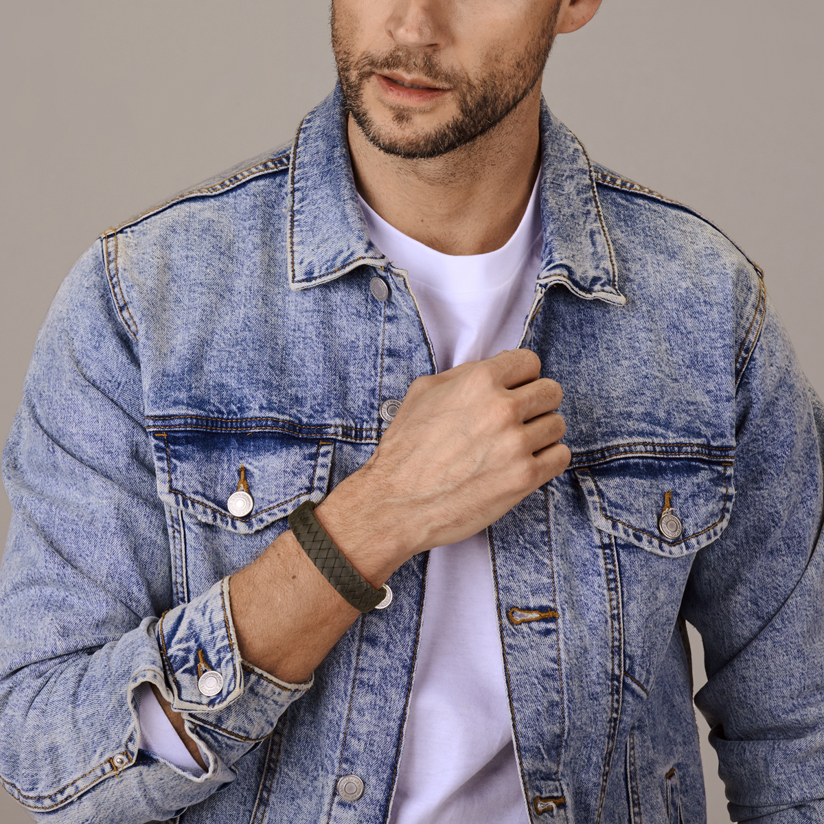 Zwart leer armband met een draaglengte van 21cm en een breedte van 15mm.