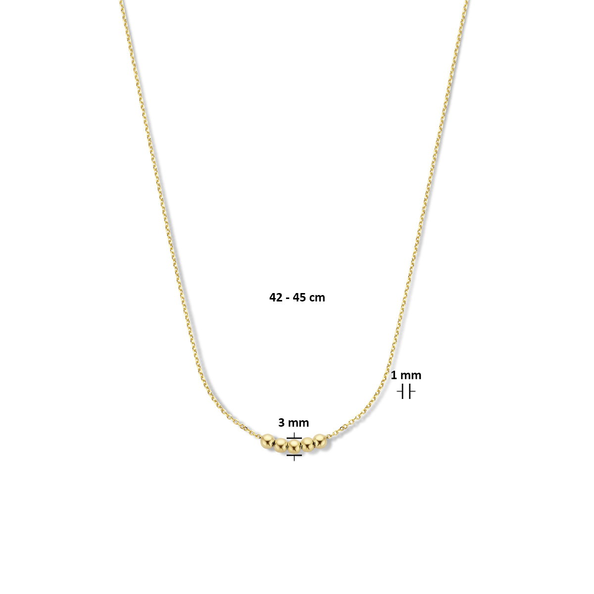 14k Geelgouden collier uitgevoerd met bolletjes en draaglengtes van 42 en 45cm. Het collier heeft een schakelbreedte van 1mm.