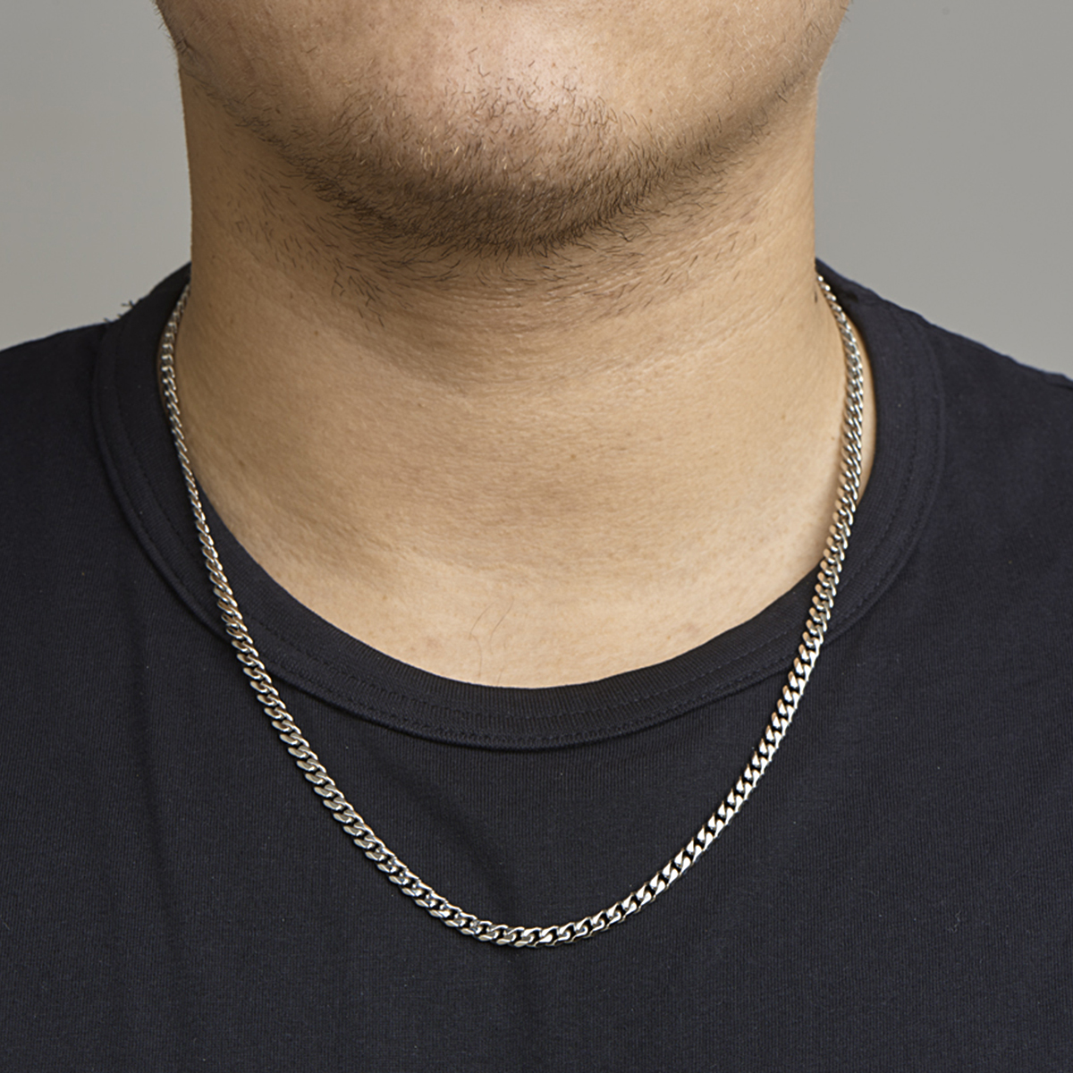 De collier is gemaakt van staal en is zilverkleurig. Het is een sieraad voor heren.