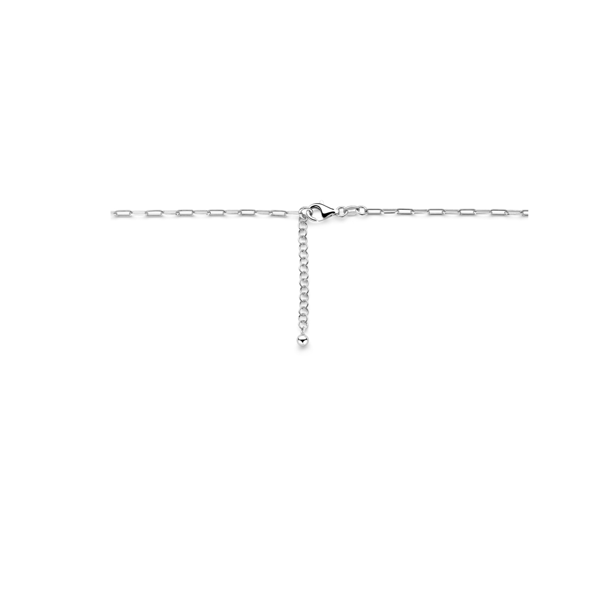 Gerhodineerd 925 zilveren collier uitgevoerd met paperclip schakel en plaatje. De schakelbreedte is 2.2mm. Het plaatje heeft een afmeting van 3x15mm. De collier heeft een lengte van 41cm met een extensie van 4cm. Uitgevoerd met karabijnsluiting.