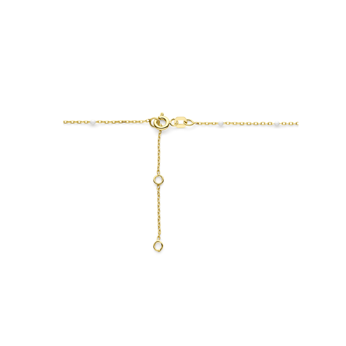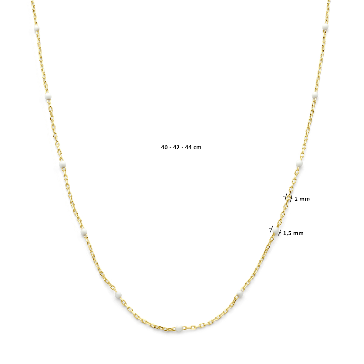 14k Geelgouden collier uitgevoerd met wit emaille. Het collier heeft draaglengtes van 40, 42 en 44cm. Het collier is uitgevoerd met een karabijnsluiting.