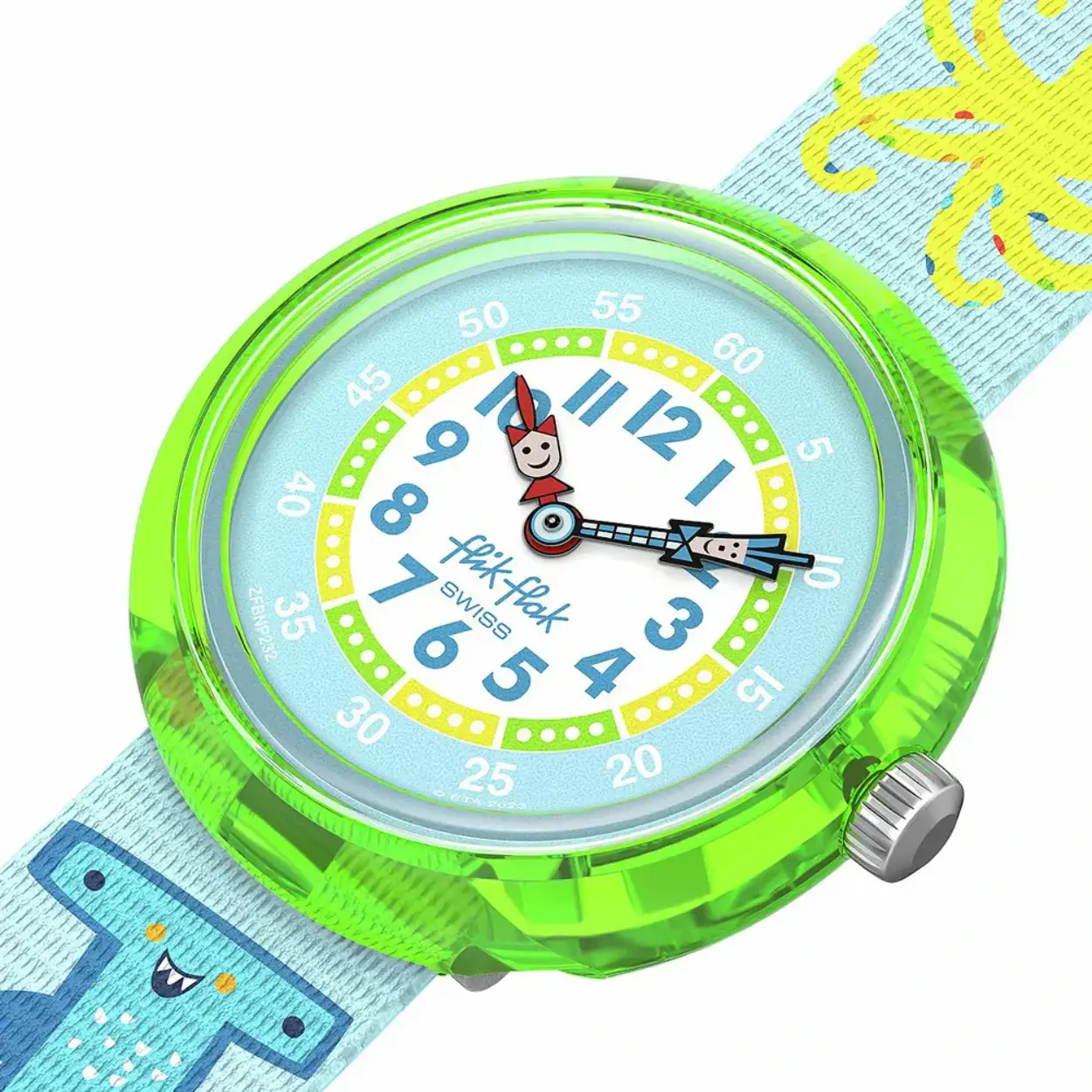 Dit Flik Flak horloge heeft een kast gemaakt van Bio-plastic met een diameter van 30 mm en is voorzien van een textiel band. In de kast bevindt zich een ETA kwaliteitsuurwerk en is afgewerkt met Plexiglas.