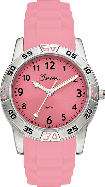 Garonne kinderhorloge met een roze band. De kastbreedte is 29 mm. De band is van soepel rubber in een vrolijke kleur.