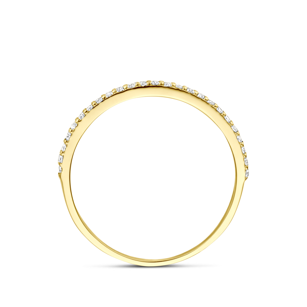 14k Geelgouden ring uitgevoerd met zirkonia. De ring heeft een breedte van 1.3mm.