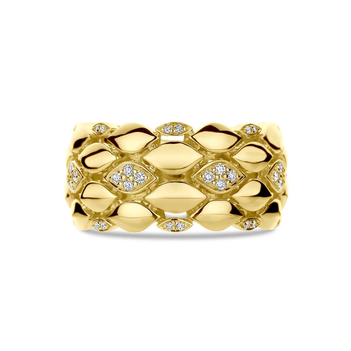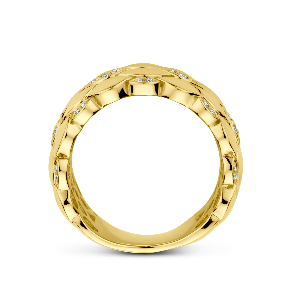 14k Geelgouden ring uitgevoerd met diamant. De ring heeft een breedte van 11mm. Het totale diamantgewicht is 0.17ct.