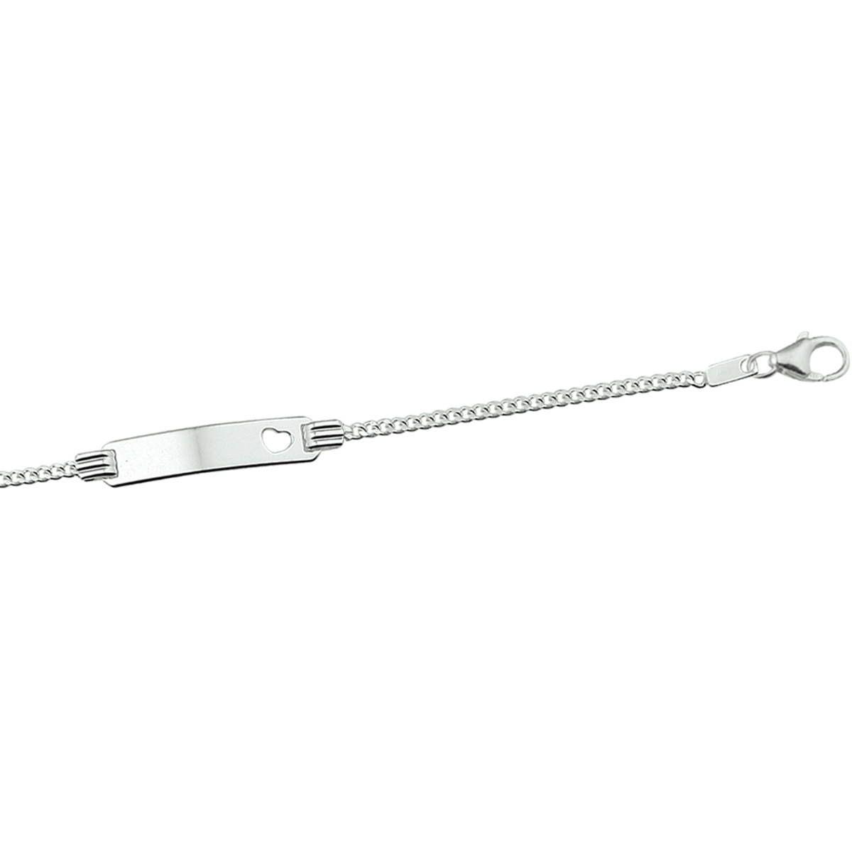 Zilveren graveerarmband met een gestanst hartje. De lengte bedraagt 11cm met 2cm extensie. De breedte van de graveerplaat bedraagt 4.2mm.