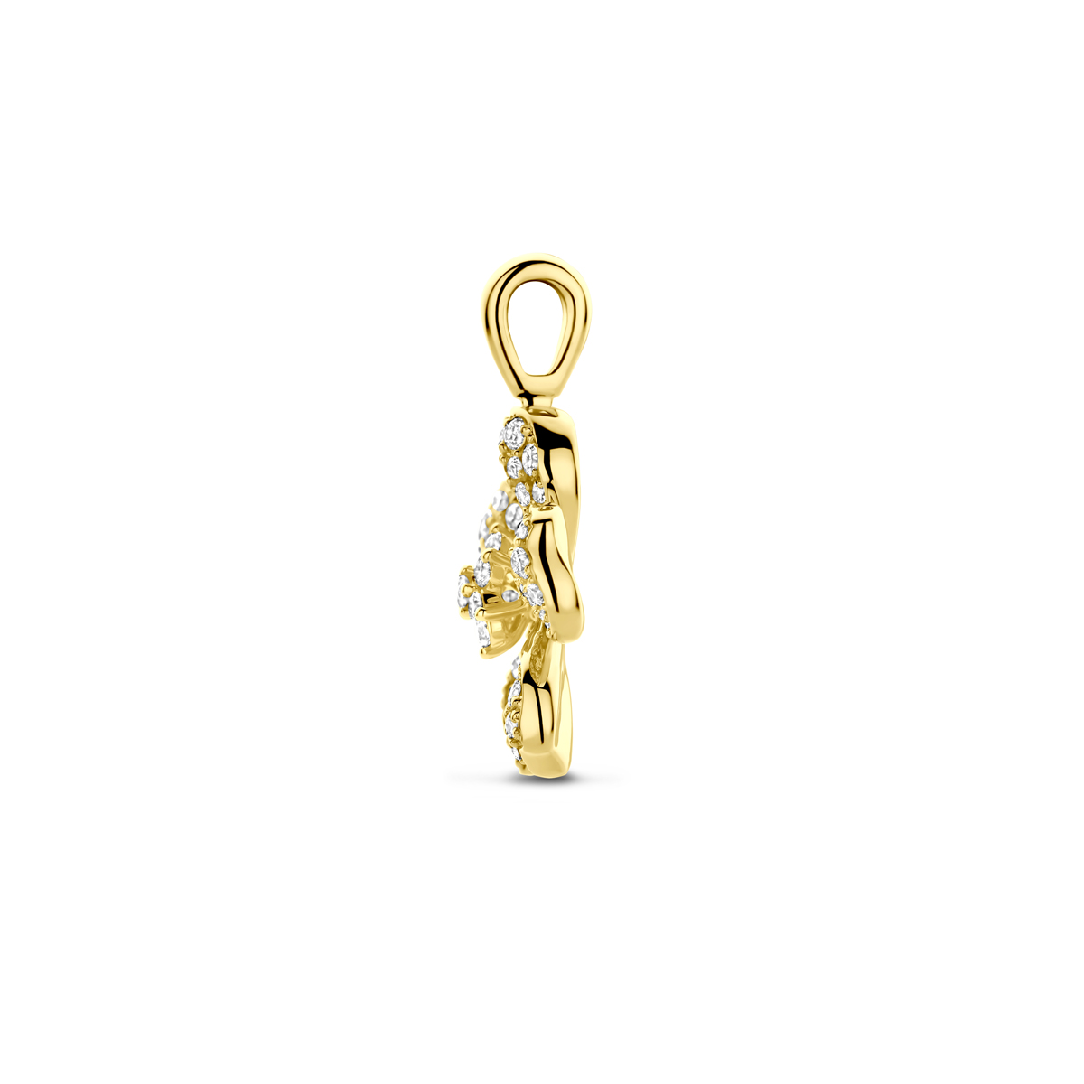 14k Geelgouden hanger uitgevoerd in de vorm van een bloem met diamant. De hanger heeft een afmeting van 21.5x16mm. Het totale diamantgewicht is 0.75ct.