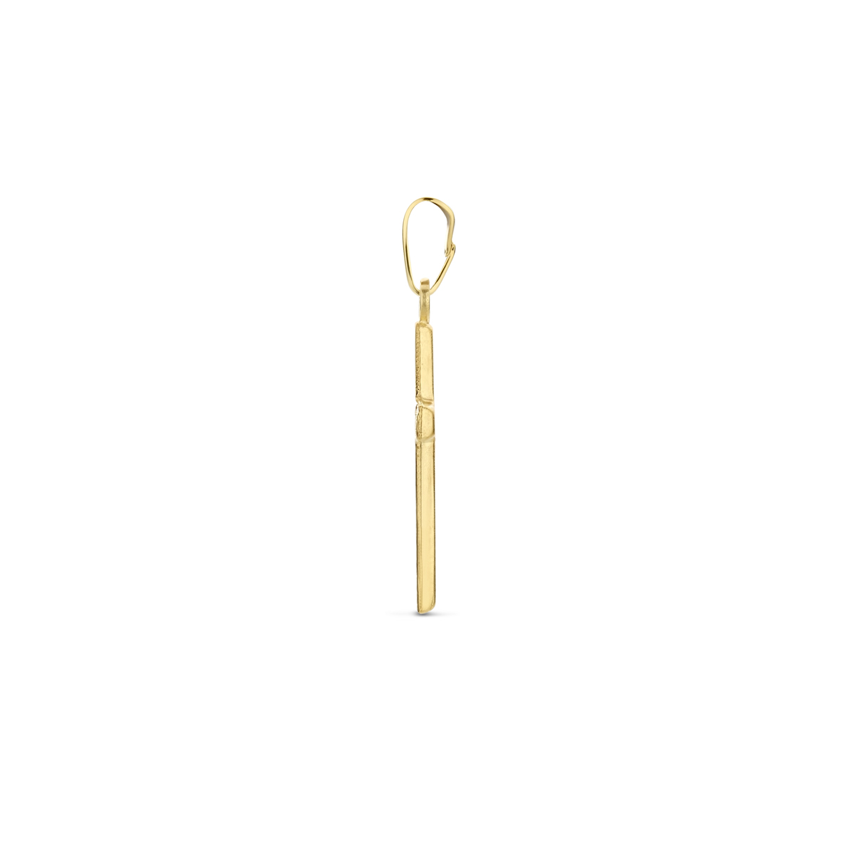 14k Geelgouden hanger in de vorm van een kruis. De hanger is drie delig bewerkt gehamerd, gediamanteerd en gepolijst. De hanger heeft een totale hoogte van 26mm en een afmeting van 18x12mm.