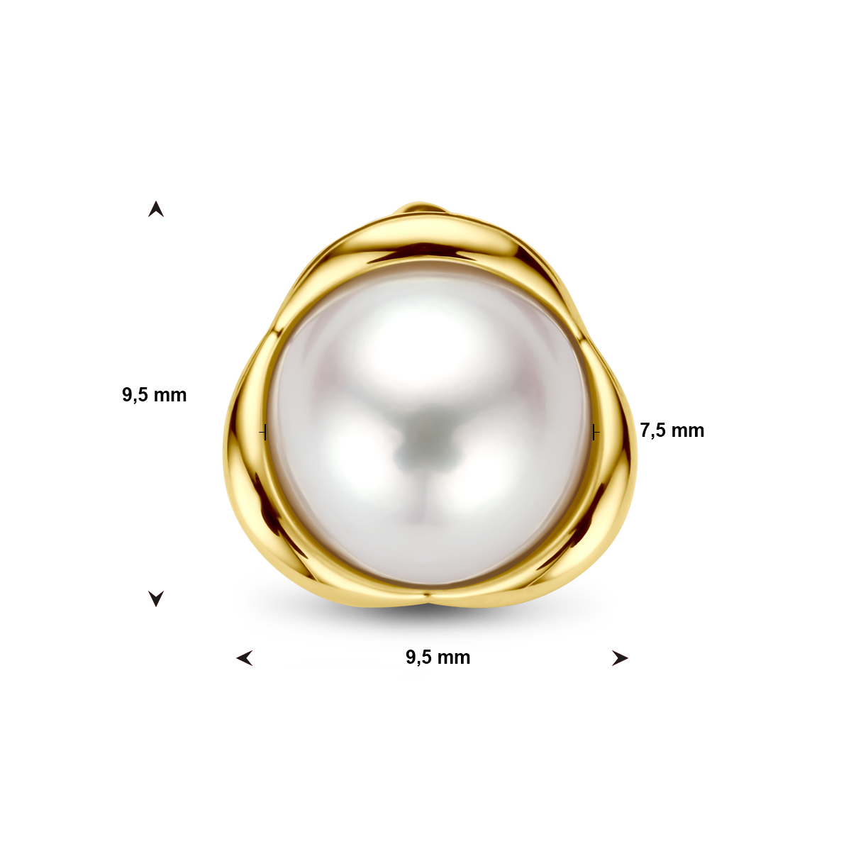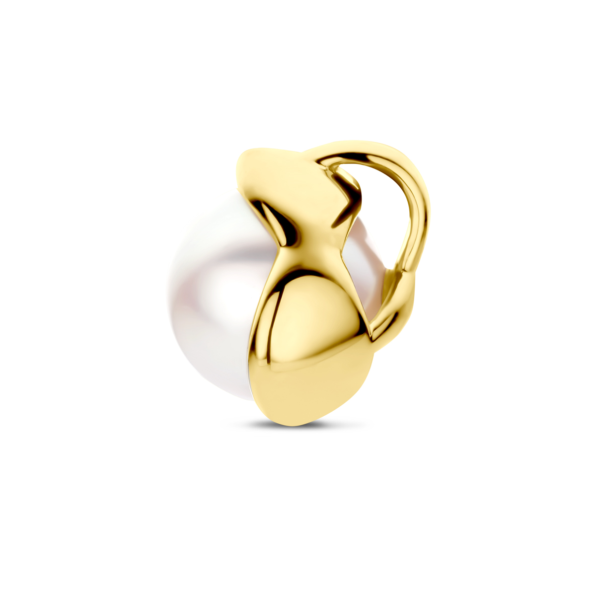 14k Geelgouden hanger uitgevoerd met een zoetwaterparel. De hanger heeft een afmeting van 9.5x9.5mm en de parel heeft een diameter van 7.5mm.