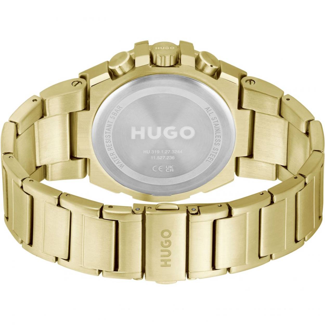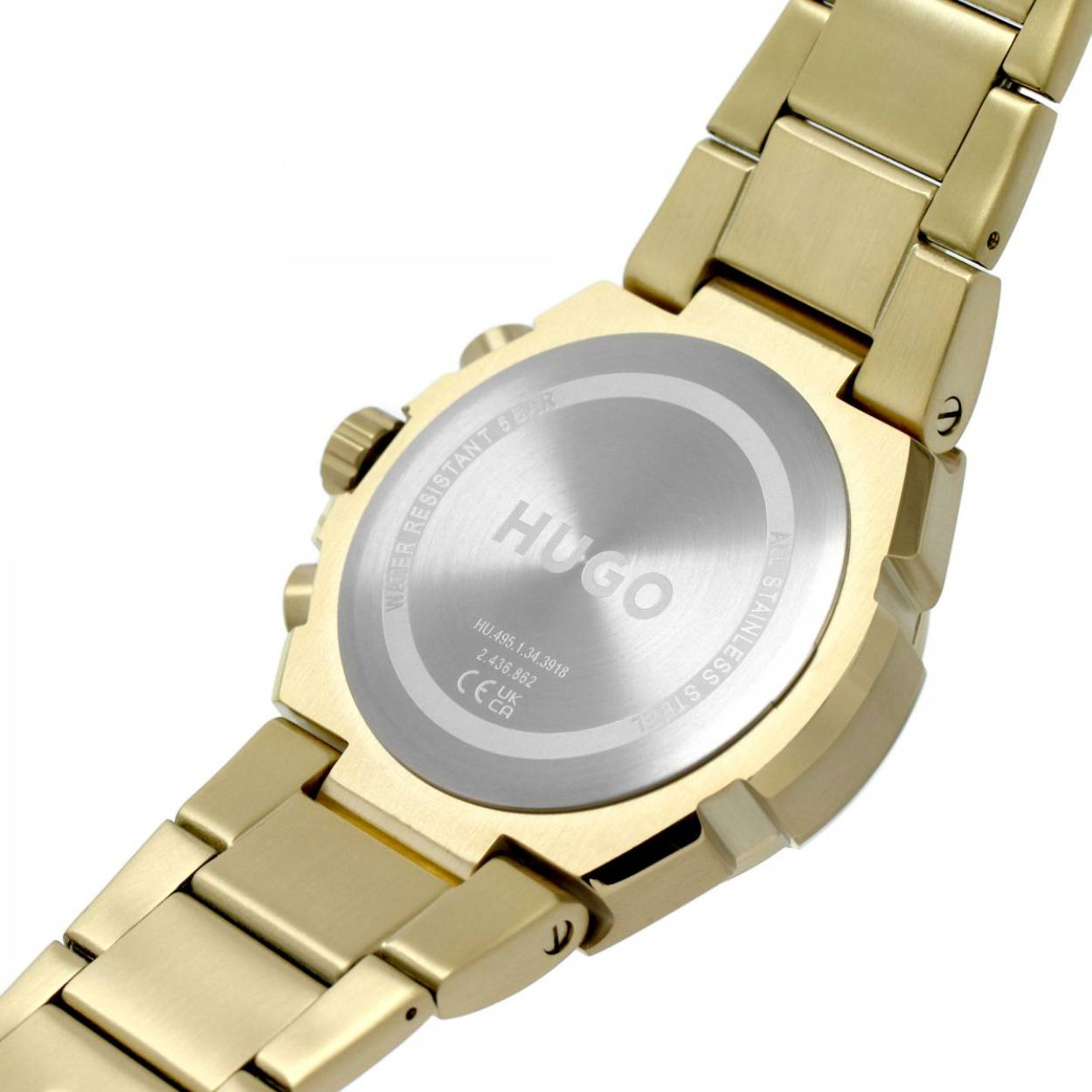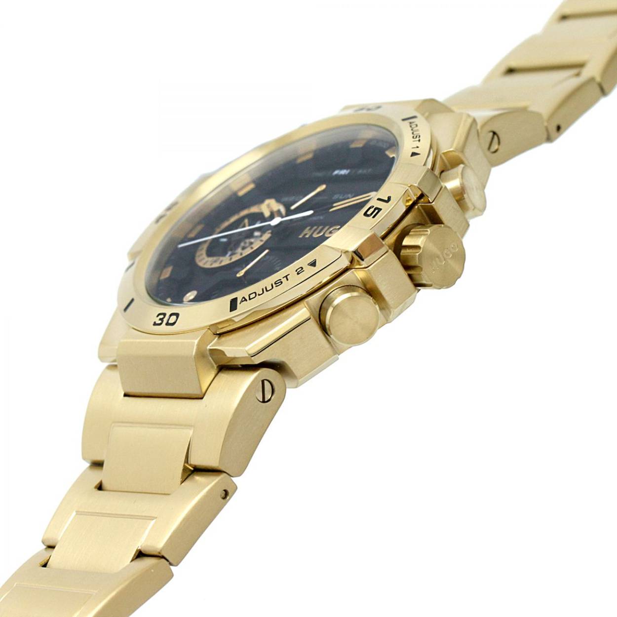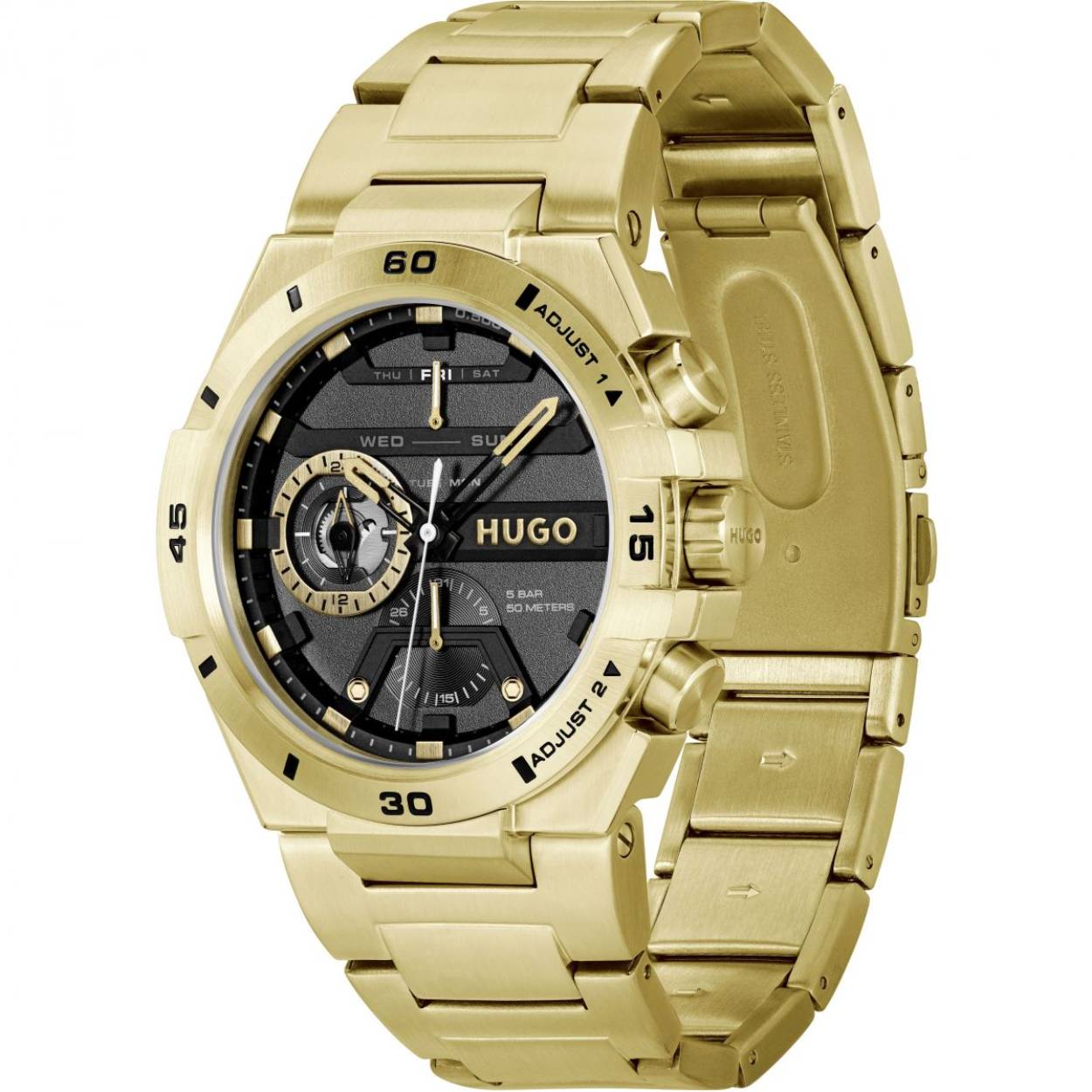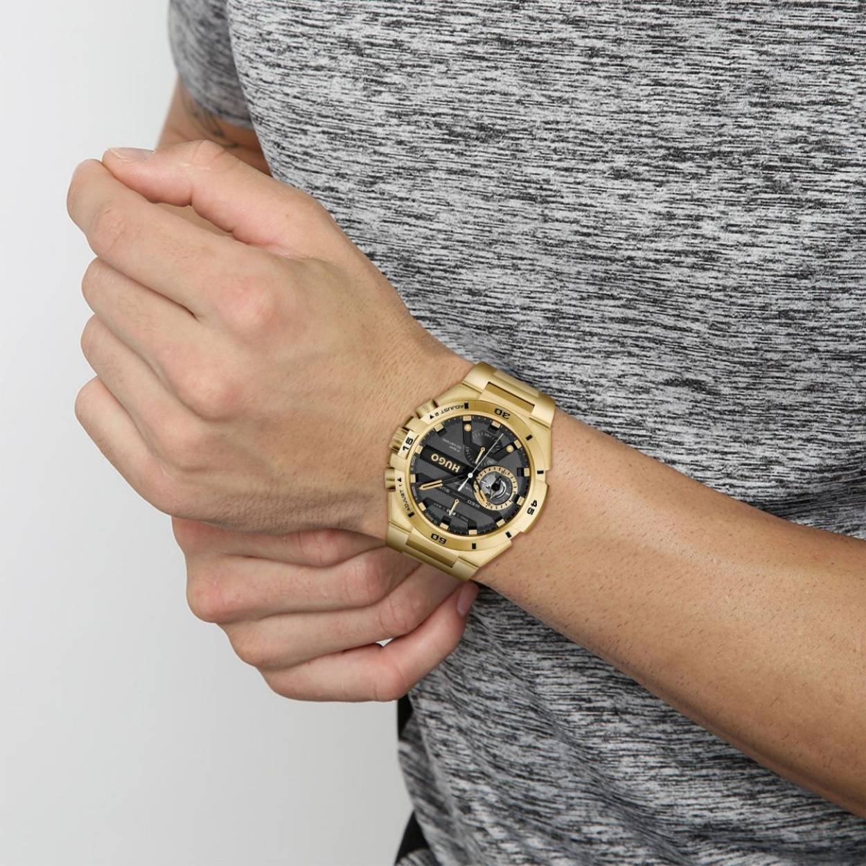 Een futurische bezel met een matte goldplated coating geeft dit waterdichte horloge een hedendaags uiterlijk met de stijl die u gewend bent van een merk als Hugo Boss. De band loopt vloeiend over in de kast en de datum is gemakkelijk te verstellen bij schrikkelmaanden door middel van de knoppen boven en onder de kroon.