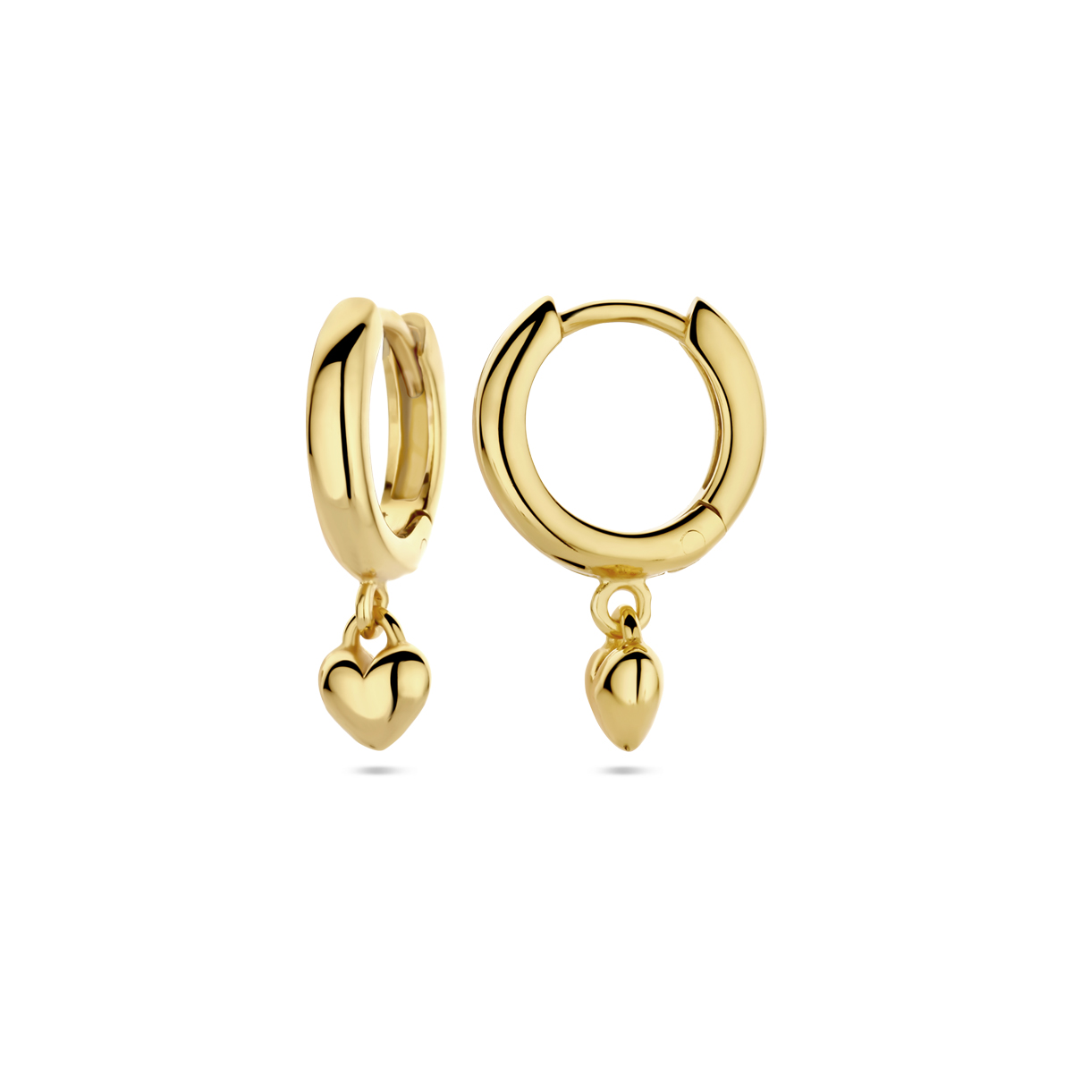 Geelgoud op 925 zilveren klapoorringen met een hart hanger van 4x4.5mm. De oorringen hebben een totale hoogte van 16mm. Geen garantie op plating.