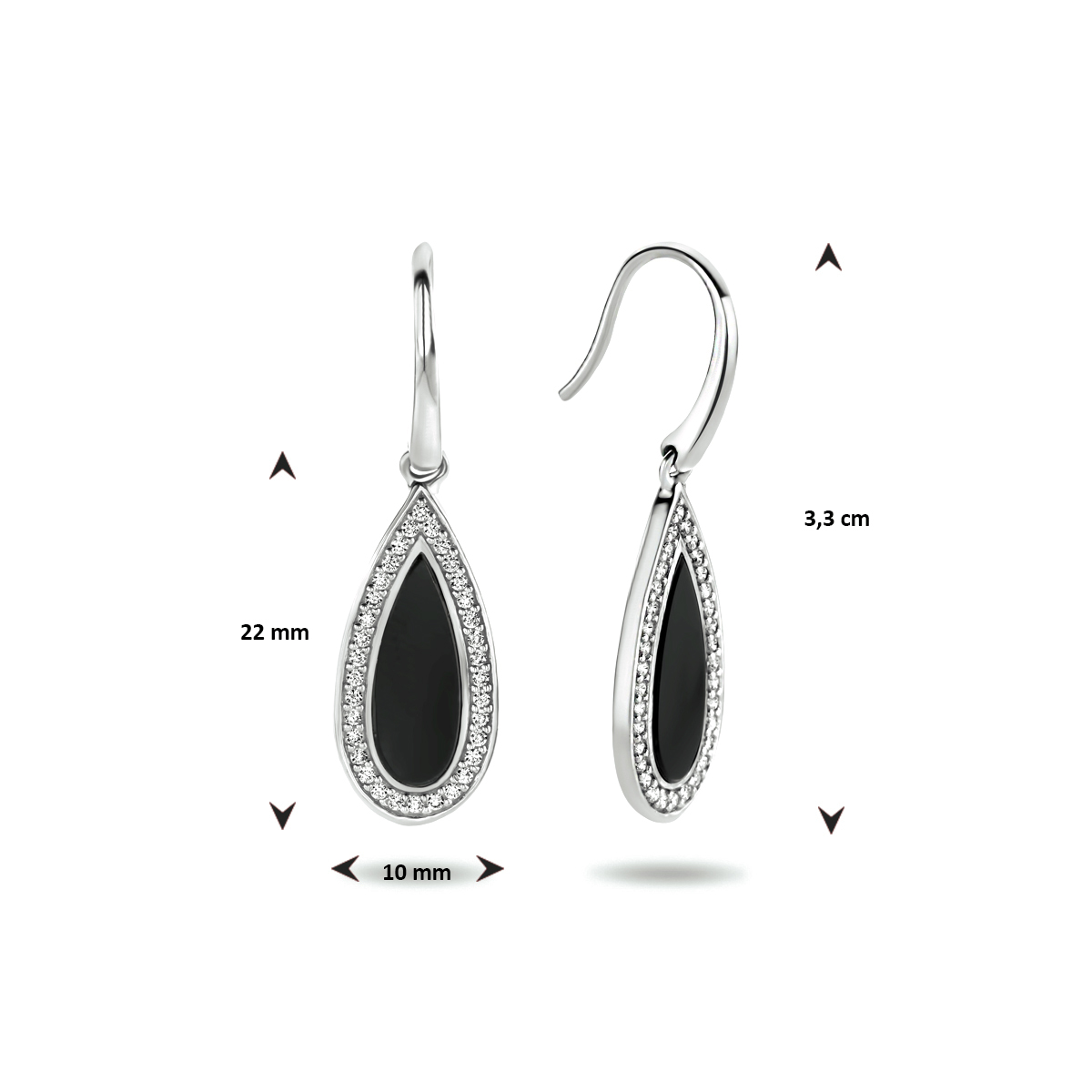 Gerhodineerd 925 zilveren oorhangers uitgevoerd met een schitterende onyx en zirkonia rij. De oorhangers hebben een totale hoogte van 3.3cm en een breedte van 10mm.