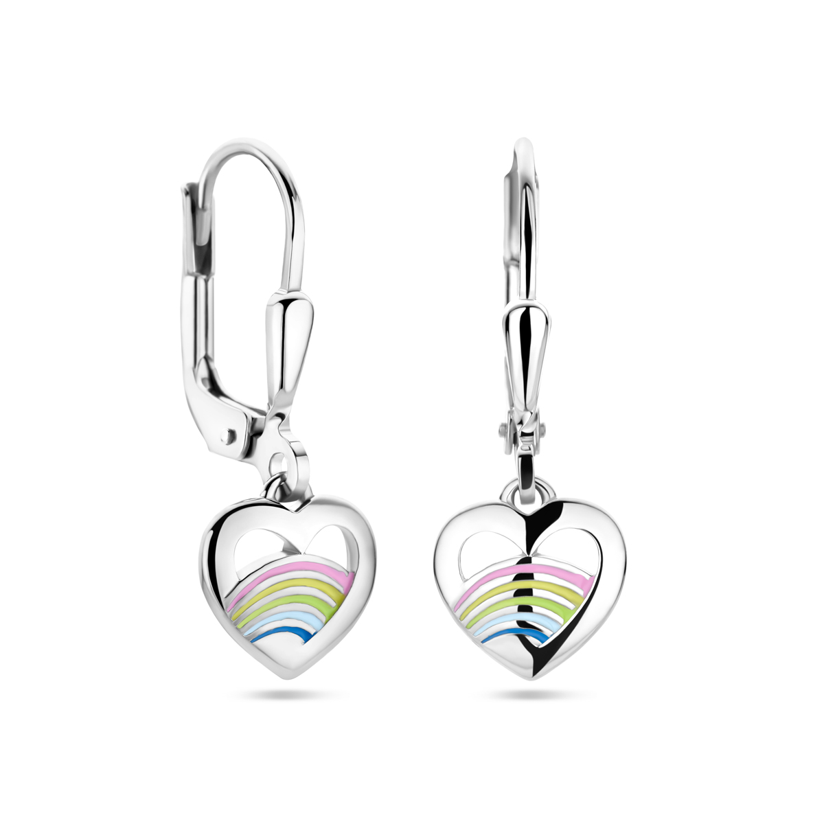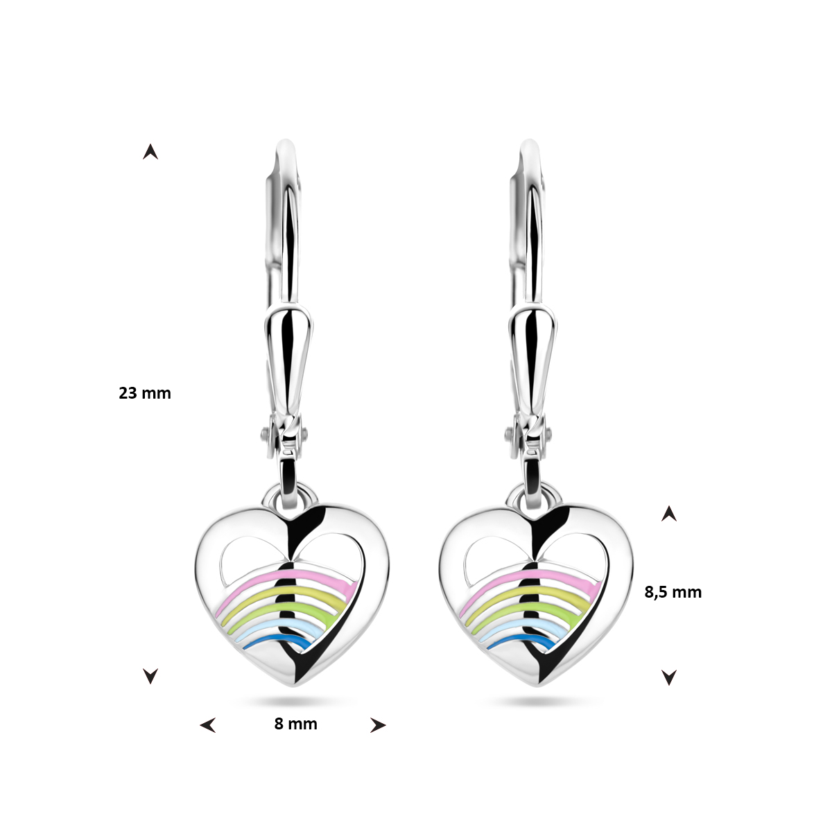 Gerhodineerd 925 zilveren oorhangers uitgevoerd in de vorm van een hart met roze, geel, groen en blauw emaille. De oorhangers hebben een totale hoogte van 23mm.