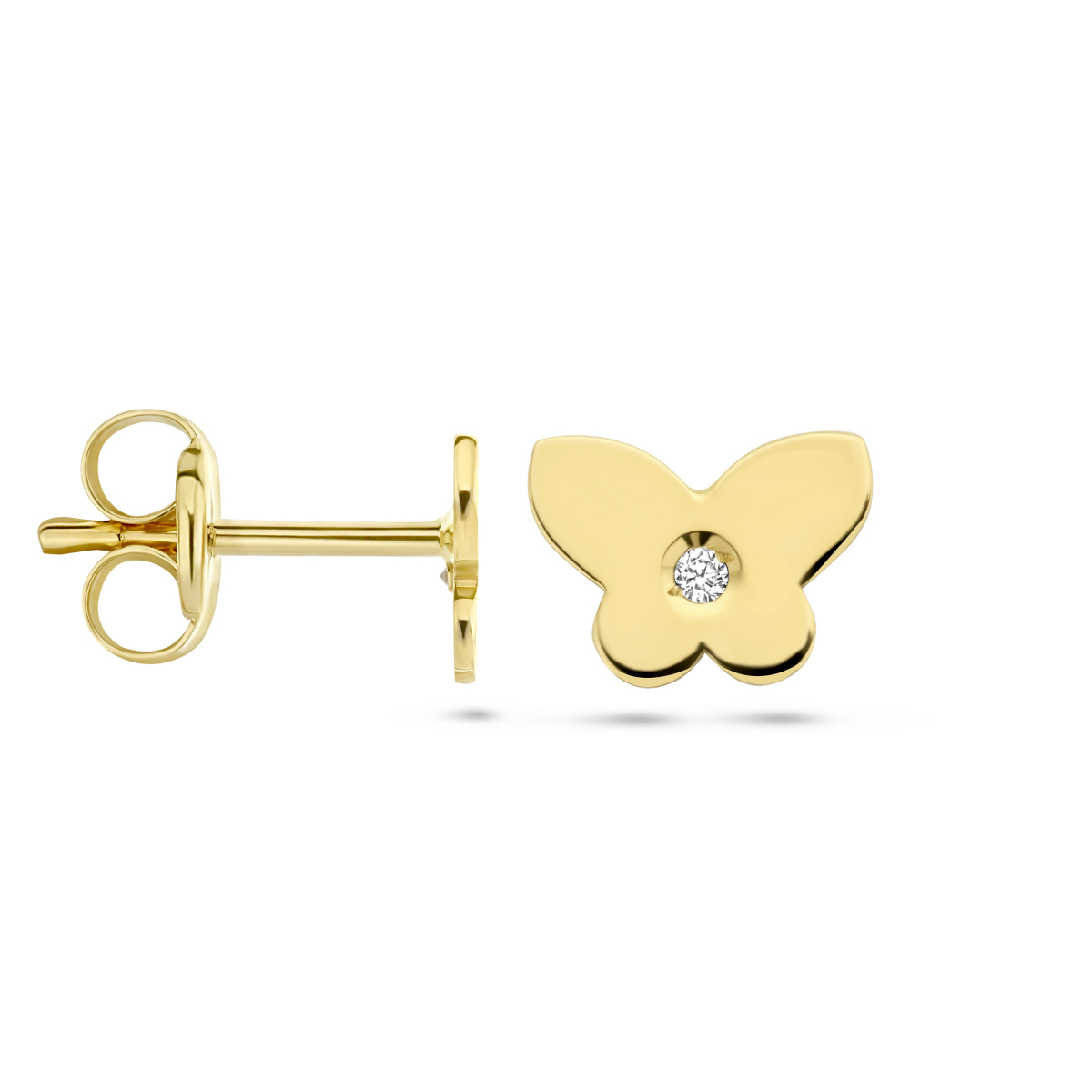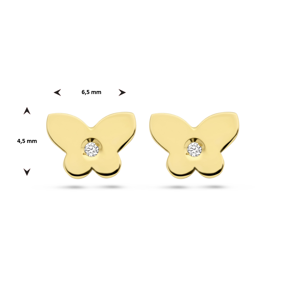14k Geelgouden oorknoppen in de vorm van een vlinder uitgevoerd met zirkonia. De oorknoppen hebben een afmeting van 4.5x6.5mm.