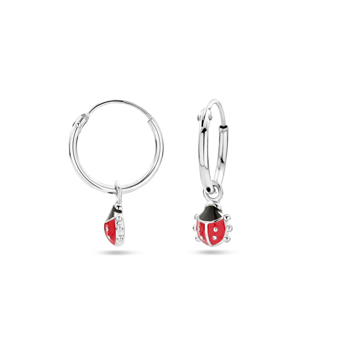 Gerhodineerd 925 zilveren oorringen met een kever voorstelling. De oorringen hebben een diameter van 13mm.