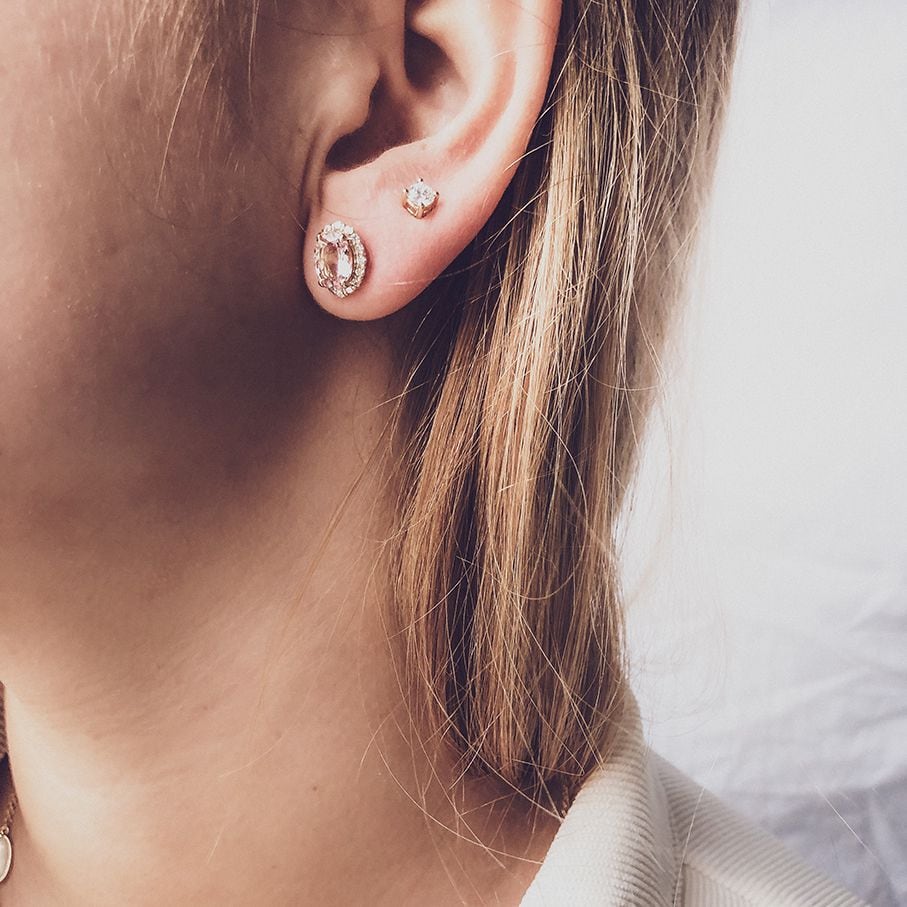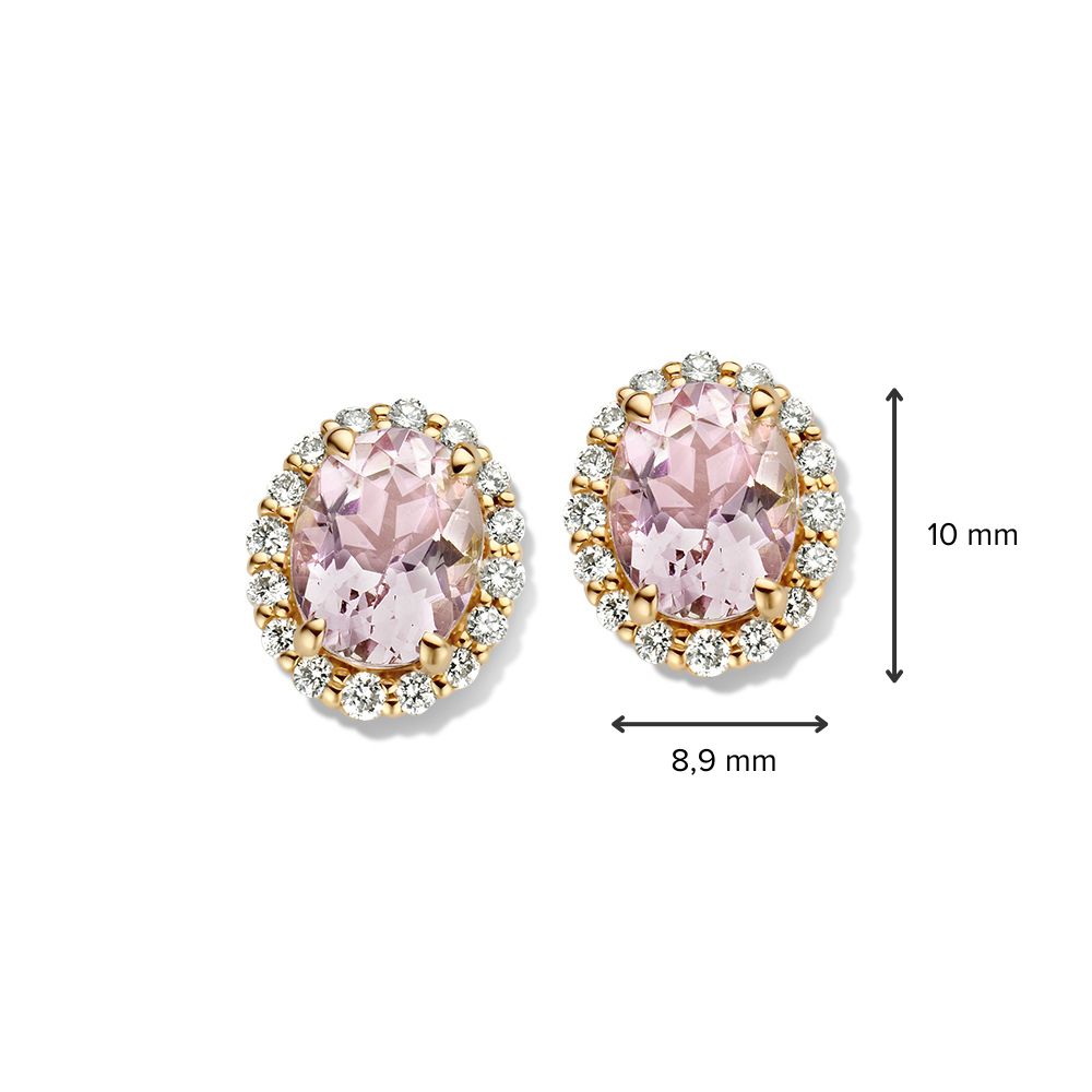 Geelgouden oorstekers met morganiet en diamant.