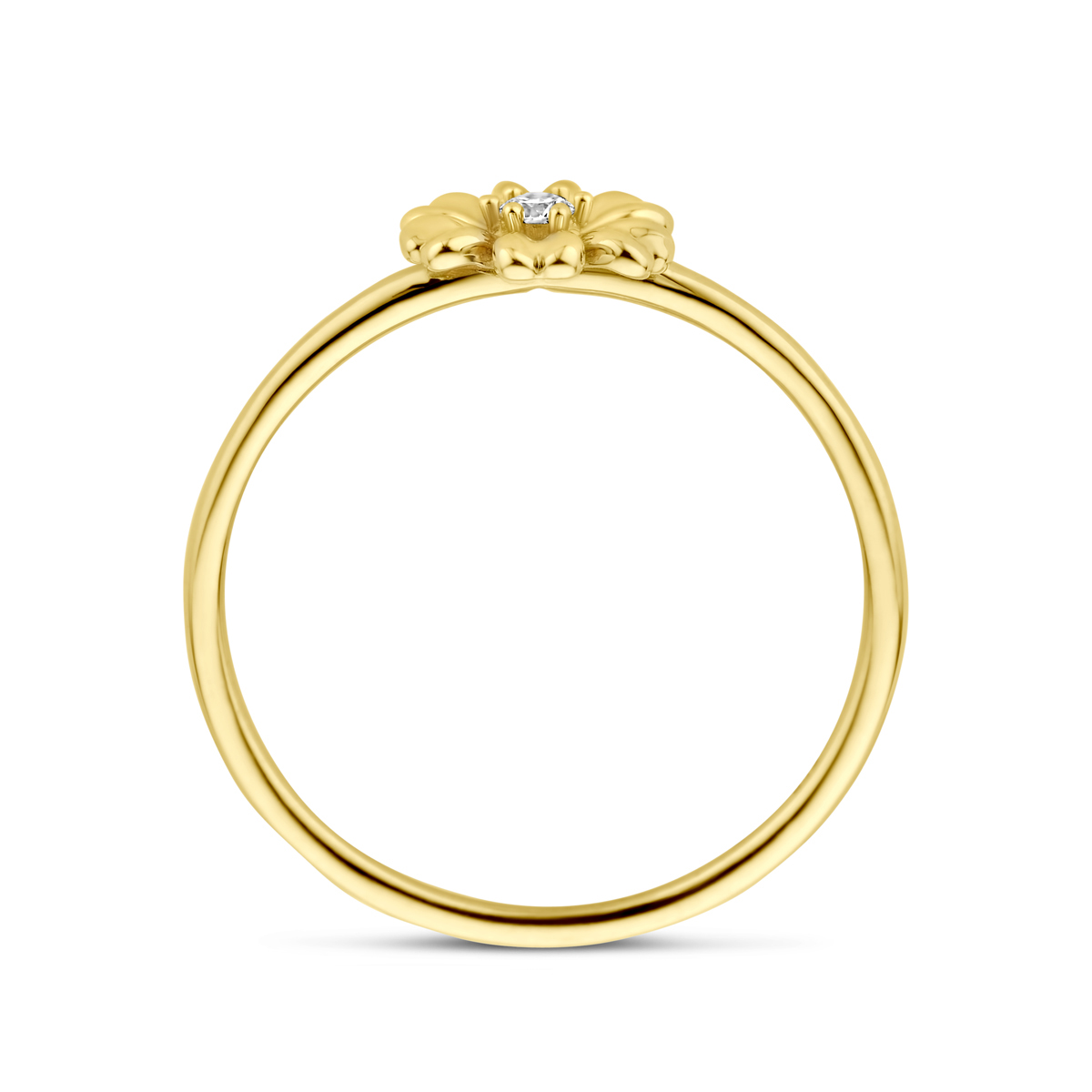 14k Geelgouden ring uitgevoerd in de vorm van een bloem met zirkonia. De ring heeft een breedte van 7.5mm.