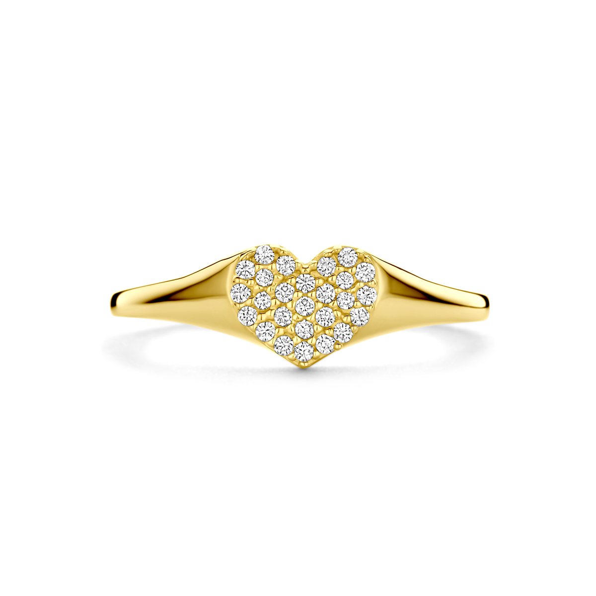 14k Geelgouden ring uitgevoerd in de vorm van een hart van zirkonia. De ring heeft een breedte van 6mm.
