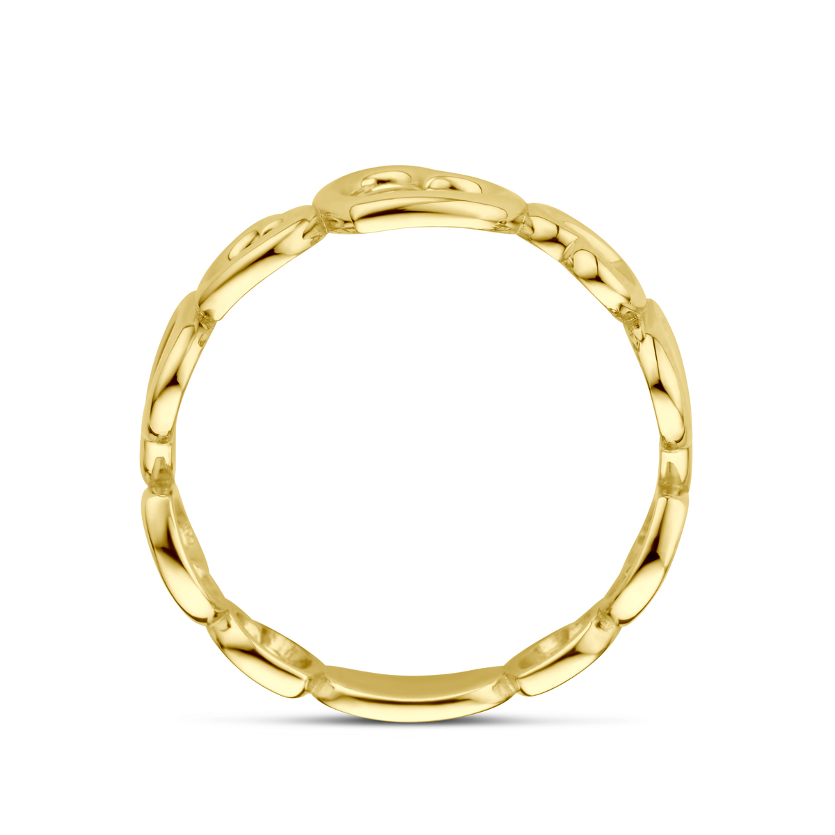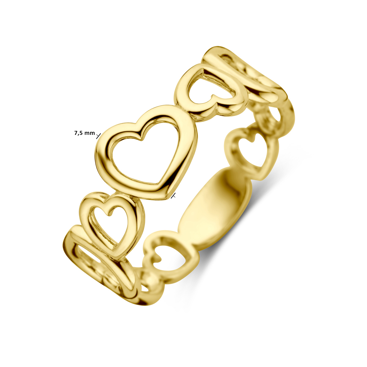 14k Geelgouden ring uitgevoerd met hartjes. De ring heeft een breedte van 7.5mm.