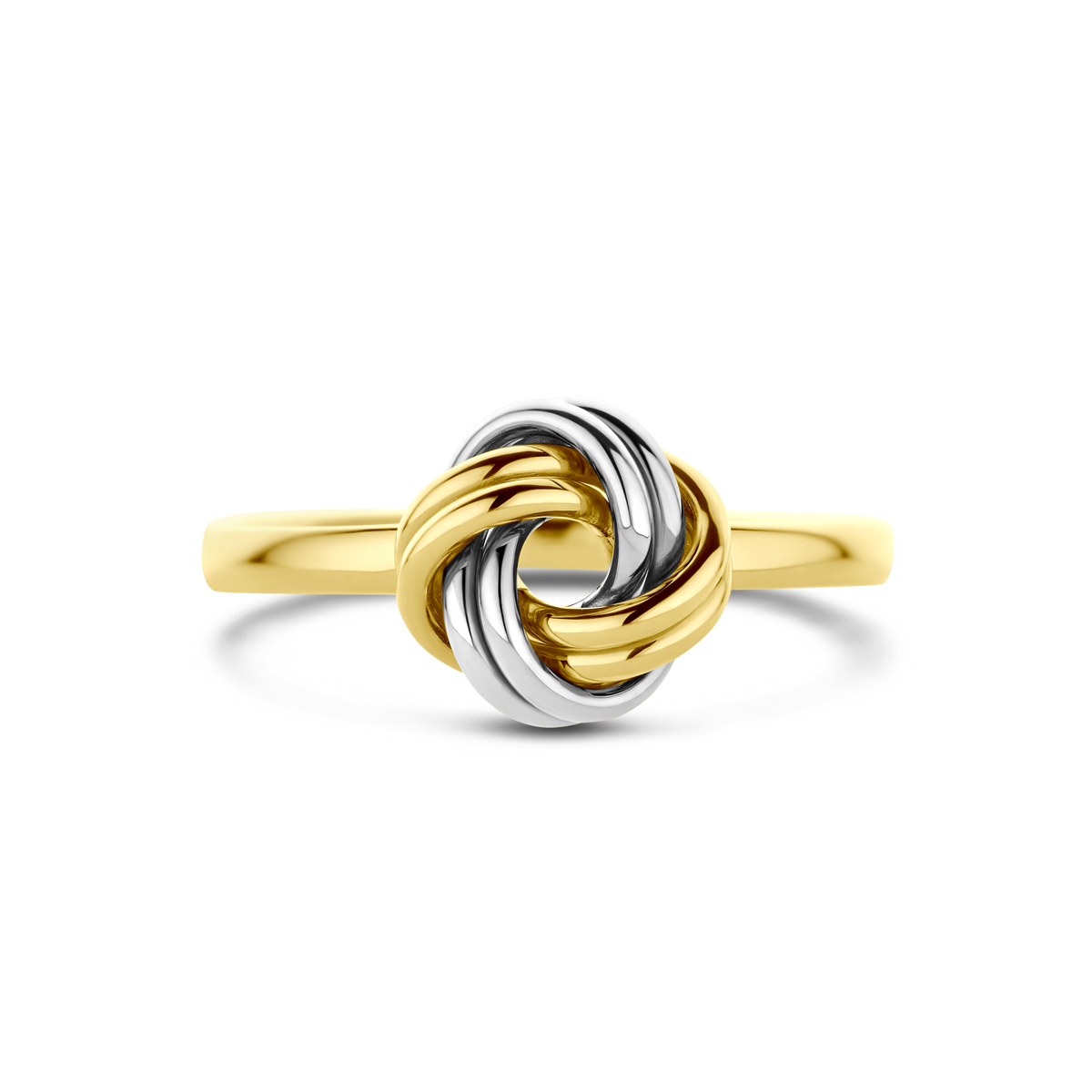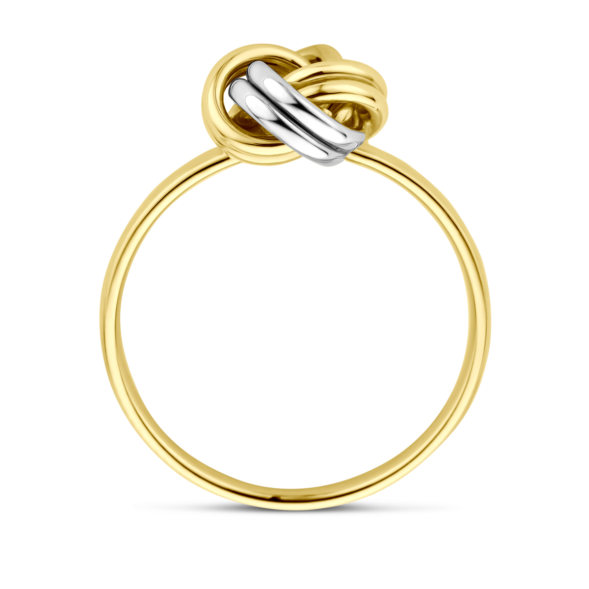 14k Bicolor geel- en witgouden ring uitgevoerd in de vorm van een knoop. De ring heeft een breedte van 9mm.