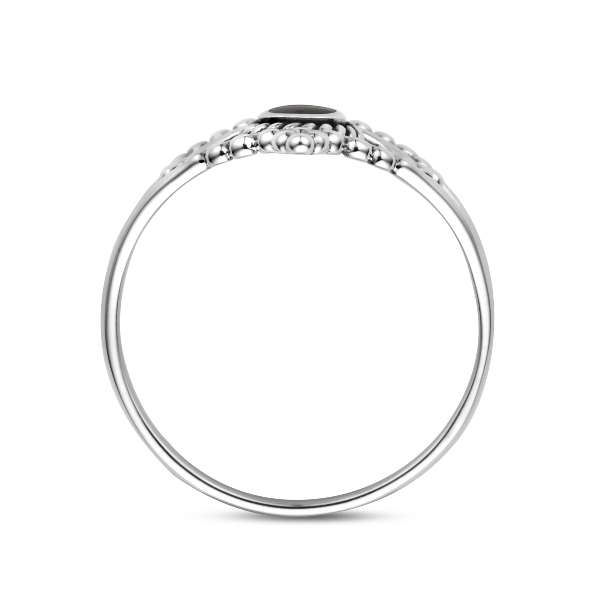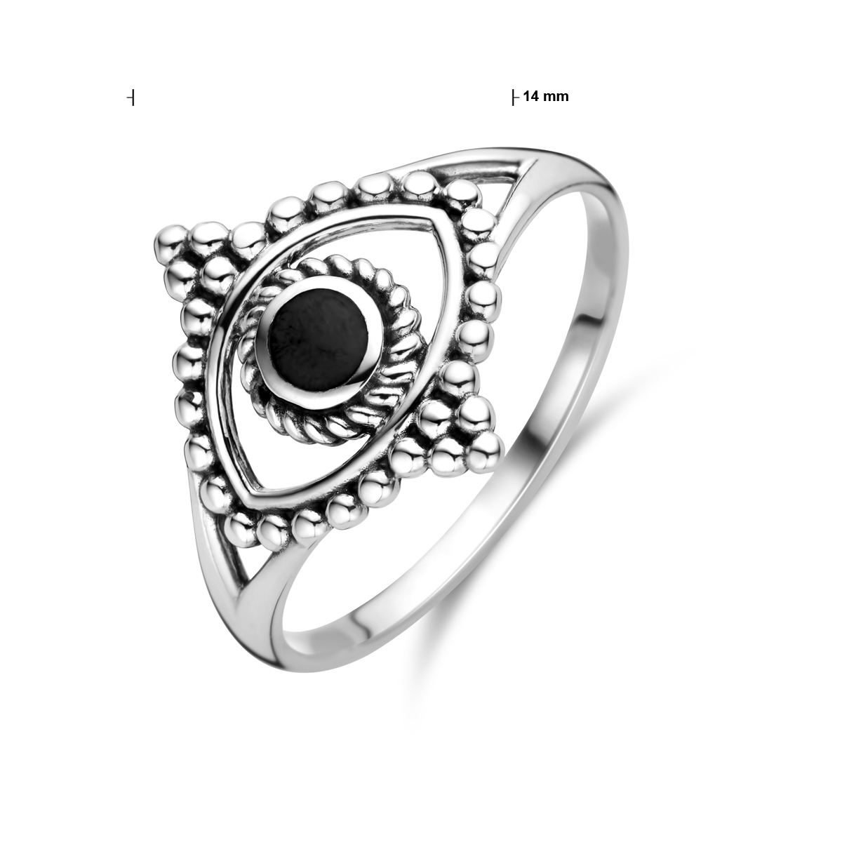 Geoxideerd 925 zilveren ring uitgevoerd met synthetisch zwart steen. De ring heeft een breedte van 14mm.