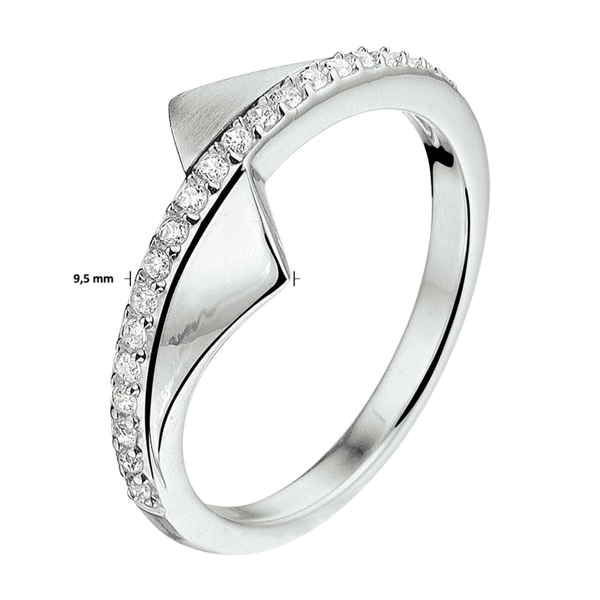 Stijlvolle gerhodineerd zilveren ring met een schitterende rij van zirkonia en een poli/matte afwerking. De ring heeft een breedte van 9.5mm. Info: Gerhodineerd zilver is door de rhodiumlaag beter bestand tegen verkleuren en krassen.