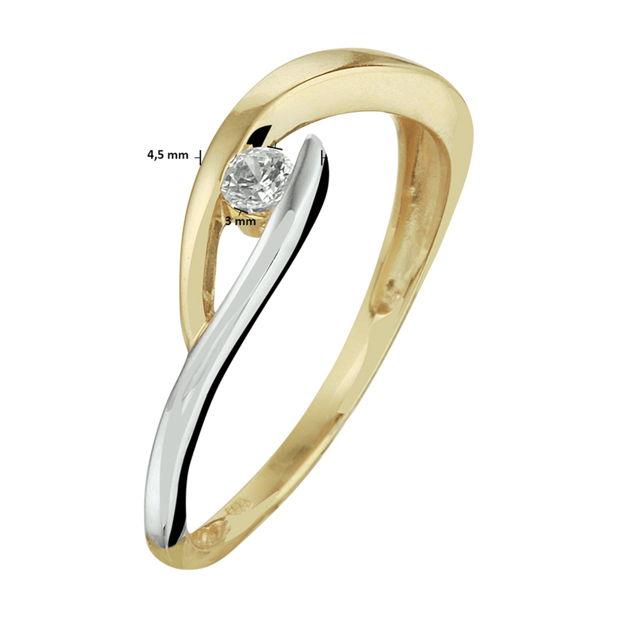 14k Bicolor wit- en geelgouden ring uitgevoerd met een heldere zirkonia. De ring heeft een breedte van 4.5mm.