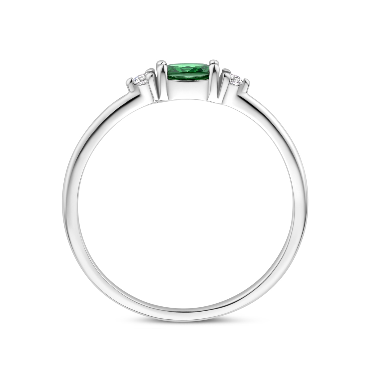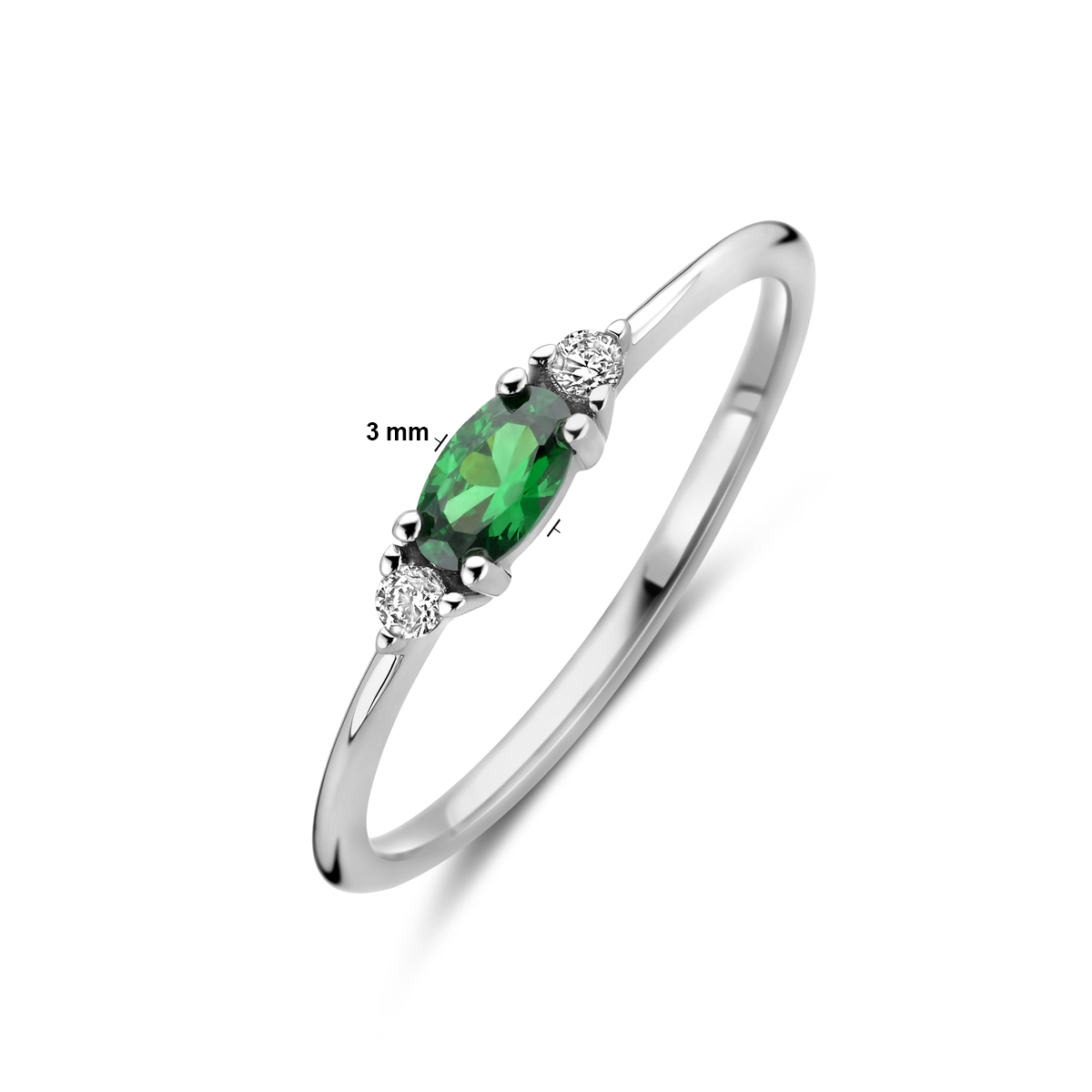 Gerhodineerd 925 zilveren ring uitgevoerd met wit en groen zirkonia. De ring heeft een breedte van 3mm.